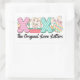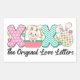 This adorable image features the word "XOXO" with each letter uniquely decorated. The first "X" is pink with white flowers, the "O" is a cute bunny sitting in a pink polka-dotted basket, the second "X" has a green and white chevron pattern, and the final "O" is a colourful diamond pattern with bunny ears. Small carrots and flowers accent the letters, adding a playful touch. Below the letters, the phrase "The Original Love Letters" is written in a stylish script. This charming design is perfect for adding a touch of love and whimsy to any envelope seal or sticker.
