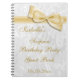 Elegant Surprise Birthday Party guest book for any age. XXth Surprise Birthday Party! Beautiful white damask pattern background with a pretty, stylish romantic gold bow and ribbon image. These glamourous, classy guest books are perfect for women and teenage girls and are decorated / printed on the front side only. Teenagers and adults alike will love this chic modern surprise party guest book. Can be used for any age:- 17th 18th 19th 20th 21st 30th 40th forty 50th fifty 60th sixty 70th seventy 80th eighty 90th ninety 100th one hundred. PLEASE NOTE: All products on Zazzle have flat printed images. Bow and ribbon images purchased from digital-designs-by-elena. If you need any assistance customizing your product please contact me through my store and I will be happy to help.