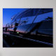 Yacht at the marina captured during a blue hour with setting sun colouring the horizon and reflection of a boat and marina visible from the yacht side poster.