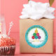 Cute Christmas tree made out of colourful balls of yarn, along with crochet hooks, personalized with your name and text on this to/from sticker for gifting your list with handmade crocheted crafts.