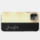 Personalize your name in white script on a black stripe with yellow gold background for a contemporary and dynamic look. A modern style that will dress-up your phone case perfectly. Makes a great gift.