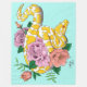 A Yellow Albino Ball Python is coming around pink and peach roses in a backdrop of teal.