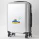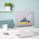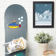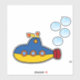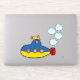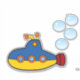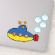 A vinyl decal with a cute cartoon illustration of a blue and yellow toy submarine with some little blue bubbles