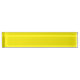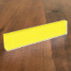 Yellow and orange abstract shapes overlap on a pla nameplate