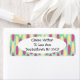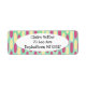 These return address labels have a geometric design of made of a background of sea-green and light blue rectangles with yellow and pink ovals on top.