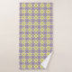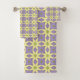 Towels with a geometric floral pattern in yellow and purple are displayed. The top image shows them hanging; the bottom shows a folded washcloth.