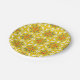 A vibrant round plate with a symmetrical yellow and white geometric pattern featuring bold red and blue floral designs. Shown in front view and at an angle.
