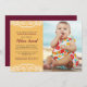 Invite loved ones to your baby's first rice feeding with this bold Annaprashana ceremony invitation. The front of the invite features a photo on the right and the event details on the left. White decorative designs frame the top and bottom of the text. The yellow background colour on the front and the deep red background on the back are both editable if you prefer other colours. Easily add your photo and customize the ceremony information for a unique, stylish Annaprashana invitation.