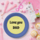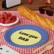 A cool yellow and purple big dot design in trending colours with a text template. Click personalize to change the short words to your liking, or buy it as is.