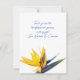 Floral thank you flat card with bird of paradise flower design. White paper with dark blue script for a message and signature, as you prefer. Use for weddings, birthdays, or other occasions. A big yellow gold, exotic flower decorates the bottom of this vertical card. Reverse is solid golden yellow.