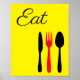 This poster is black and teal with the text, "Eat," with a graphic of fork, knife and spoon. Modern sleek look will add a pop of colour to your kitchen.