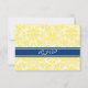 Wedding RSVP cards in elegant and contemporary bright lemon yellow, dark navy blue, and white classic and chic floral vintage damask pattern. Customizable with your wedding details, available in many matching wedding products.