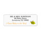 A Sweet Baby is on the Way in orange script. Name and address in black typography. Cute smiling yellow bumble bee with black stripes and fluttering wings buzzing by for the Baby Shower. Original Artwork by TamiraZDesigns.
