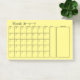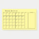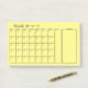 A yellow monthly calendar post it notes, which has a blank calendar, a box for notes and a box for reminders. You can personalize the "reminders" box if you would like to change it. The top says month with a heart arrow pointing to the space you can write by hand the month. A calendar post it notes to use at home, home office, dorm, for school, work, etc.
