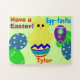 One-of-a-kind Personalized Easter Bunny Puzzles for boys and girls shown on a light green spring coloured background. With the wording in red, blue and purple, Have A Egg-tastic Easter. Personalize with Child's Name shown in orange text. Cute yellow baby chick in its hatched egg in blue, purple, green and yellow stripes. Pretty decorated Easter eggs are on his trail in blue polka dots, green striped egg, and pretty purple egg with green flower and white scroll flower. With the wording, Happy Easter written in purple text. Fun Easter puzzle makes for a nice gift for boys or girls, classmates Easter party, and a nice Easter Basket idea. If you'd like a white background click Customize It and via the edit wheel uncheck transparency for whites setting for the chick egg. Original Graphic Art Hand-Painted Digital Designs © 2013 TamiraZDesigns. All Rights Reserved. Visit my store for more original items: www.zazzle.com/tamirazdesigns