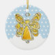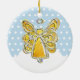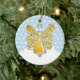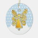 This ornament displays a beautiful white angel playing in the snow. This is the white, gold, and yellow guardian angel painting from a rainbow series of seven angel paintings. This is a great angel image to use for the holidays like Christmas or New Year's.