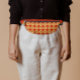 Stylish fanny pack with matching red trim for the on-the-go person and features the photo image of a yellow Dahlia bloom on a bright, red background and printed in a tiled pattern. A fun, floral design! Back of fanny pack is black.