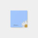 Floral sticky notes with a cute white and yellow daisy image on a blue background. Black script lettering can be personalized with your own text, great for staying organized with a soft botanical style.