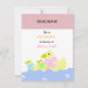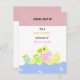 A border of pink with white circles. Little yellow ducks floating on the water each with a colourful bow around their neck. Customize with all of your baby shower information as desired.