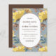 This design features an elegant botanical vintage pattern of flowers and leaves in retro style in cheerful watercolor palette of Yellow Dusky blue Brown your wedding details displayed in a modern combination of fonts over a white oval frame with a chic brown border. Perfect for summer or spring celebration, or outdoor or garden wedding with a vintage touch.