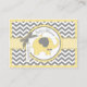 Grey and white chevron print with yellow accents with bird perched on elephant with bow-tie and a 3D-look polka-dot bow bring a book card design for a baby shower.