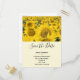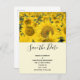 Save the date postcard with a beautiful photograph of a field of yellow sunflowers.