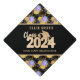 Elegant yellow and purple floral on black and gold Class of 2024 graduation cap topper. Personalized with your name and school name.