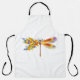 Artistically painted, floral dragonfly in contrasting orange and purple with yellow, bright, blooming California poppy and blue wildflowers on white background.
