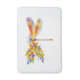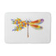Artistically painted, floral dragonfly in contrasting orange and purple with yellow, bright, blooming California poppy and blue wildflowers on white background.