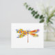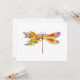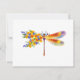 Artistically painted, floral dragonfly in contrasting orange and purple with yellow, bright, blooming California poppy and blue wildflowers on white background.