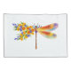 Artistically painted, floral dragonfly in contrasting orange and purple with yellow, bright, blooming California poppy and blue wildflowers on white background.