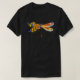 Artistically painted, floral dragonfly in contrasting orange and purple with yellow, bright, blooming California poppy and blue wildflowers on white background.