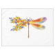 Artistically painted, floral dragonfly in contrasting orange and purple with yellow, bright, blooming California poppy and blue wildflowers on white background.