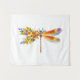Artistically painted, floral dragonfly in contrasting orange and purple with yellow, bright, blooming California poppy and blue wildflowers on white background.