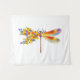 Artistically painted, floral dragonfly in contrasting orange and purple with yellow, bright, blooming California poppy and blue wildflowers on white background.