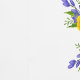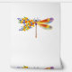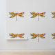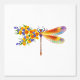 Artistically painted, floral dragonfly in contrasting orange and purple with yellow, bright, blooming California poppy and blue wildflowers on white background.
