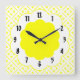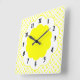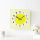 This is a pretty retro pattern clock with a bright yellow and white floral stencil background, and a scalloped edge white and yellow layered field for the easy to read numbers. Cheerful and bright!