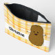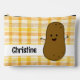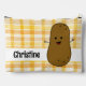 Adorable toiletry bag featuring a cute happy cartoon brown potato. The background is a cute classic pattern of white and white watercolor check gingham. A template to add your name to personalize.