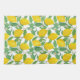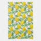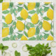 Decorative design of a pattern of yellow juicy lemons on branches with green leaves and delicate white flowers on a white background.