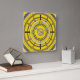 This square clock design features a pattern of nested circle shapes coloured various shades of colours like yellow and grey. It also features rectangles marking the hours, and numbers indicating the hours "12", "3", "6", and "9".