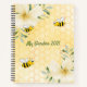 Yellow, white background with a honeycomb pattern. Decorated with light yellow, cream coloured tropical florals flowers, hibiscus and happy bumble bees. The text: My Garden 2021 (or any year) in green hand lettered style script. Perfect as notebook and planner for your garden backyard.