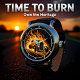 This striking watch face features a vintage-style yellow hot rod car with prominent orange and red flames painted on its side, racing along a dark, reflective road. The background is solid black, emphasizing the dynamic energy and intense fiery elements of the vehicle, creating a powerful design for automotive enthusiasts.