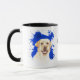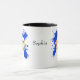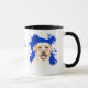 A beautiful water colour portrait of a yellow Labrador Retriever stands out against a bright blue abstract paint splatter background. The image is on two sides of the mug, with your name or other custom text in black between them.