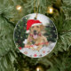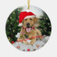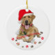 Yellow Labrador Retriever holding decorated dog bone while wearing Santa hat and jingle bell collar is posed on ceramic Christmas Ornament for your Christmas tree.
