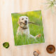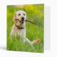 Horizontal image of a yellow labrador retriever dog sitting in grass with a stick in her mouth