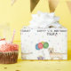 Cute birthday theme design featuring Destei's original cartoon illustration of a cute yellow coat colour Labrador Retriever breed dog. Next to the dog there are colourful birthday balloons tied on a dog bone and a purple and yellow colour present box. The background has a playful pattern of colourful pastel confetti on a white background. There is also a personalizable text area.
