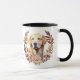 A pretty autumn wreath in tones of cinnamon brown, tan, and cream surround the image of a yellow Labrador Retriever Dog. The image is printed twice on the mug, with your custom text between them.