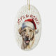On the front of this Holiday ornament is a beautiful image of a yellow Labrador Retriever dog in a Santa Claus hat. Behind the image is a gold confetti sprinkle background. Red text says "Joy to the World". The back of the ornament has the same confetti background and text fields for you to personalize each ornament.