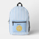 This fresh-picked backback design feature a round lemon slice on the pocket, with your monogram, against a sky blue background. The rest of the front has fresh summery sky-blue and white stripes, with the sides in a matching light blue. The look is fruity, beachy, breezy, and a little bit fun.
