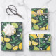 Wrapping paper sheetswith a cute pattern featuring yellow lemons and green lime fruit with stalks of leaves set on a dark green background.